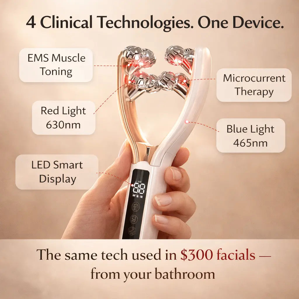 Every day after 25, your facial muscles weaken, fluid builds up, and collagen breaks down. Creams can't fix this. This device can — 5 minutes a day, from your bathroom
